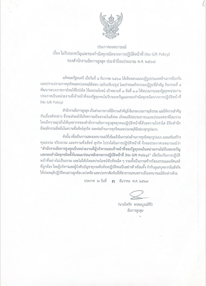นางสุรีย์ บุญไพศาล อธิบดีอัยการ สำนักงานคดีล้มละลาย เป็นประธานการประชุมการขับเคลื่อนประกาศเจตนารมณ์ฯ “No Gift Policy” ของสำนักงานอัยการสูงสุด ประจำปี พ.ศ. 2568 และได้มอบนโยบายไม่รับของขวัญและของกำนัลทุกชนิดจากการปฏิบัติหน้าที่ (No Gift Policy) เพื่อปลุกจิตสำนึกและเสริมสร้างวัฒนธรรม และค่านิยมสุจริตในการปฏิบัติงานให้กับข้าราชการฝ่ายอัยการ และบุคลากรในสังกัดสำนักงานคดีล้มละลาย ตลอดจนร่วมกันจัดกิจกรรมประกาศเจตนารมณ์ “No Gift Policy ของสำนักงานคดีล้มละลาย” ณ ห้องประชุมสำนักอธิบดีอัยการ สำนักงานคดีล้มละลาย เมื่อวันอังคารที่ 24 ธันวาคม 2567