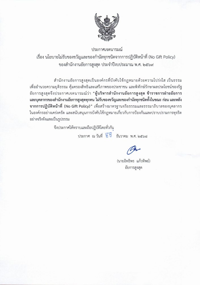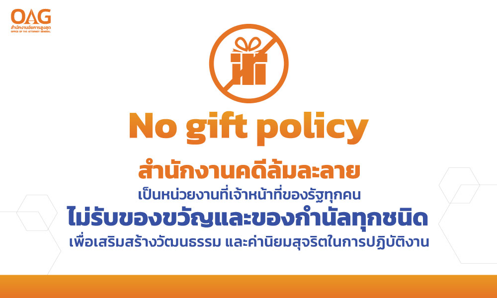 สำนักงานคดีล้มละลาย ขับเคลื่อนประกาศเจตนารมณ์ฯ “No Gift Policy” ของสำนักงานอัยการสูงสุด ประจำปี พ.ศ. 2569 และได้มอบนโยบายไม่รับของขวัญและของกำนัลทุกชนิดจากการปฏิบัติหน้าที่ (No Gift Policy) เพื่อปลุกจิตสำนึกและเสริมสร้างวัฒนธรรม และค่านิยมสุจริตในการปฏิบัติงานให้กับข้าราชการฝ่ายอัยการ และบุคลากรในสังกัดสำนักงานคดีล้มละลาย