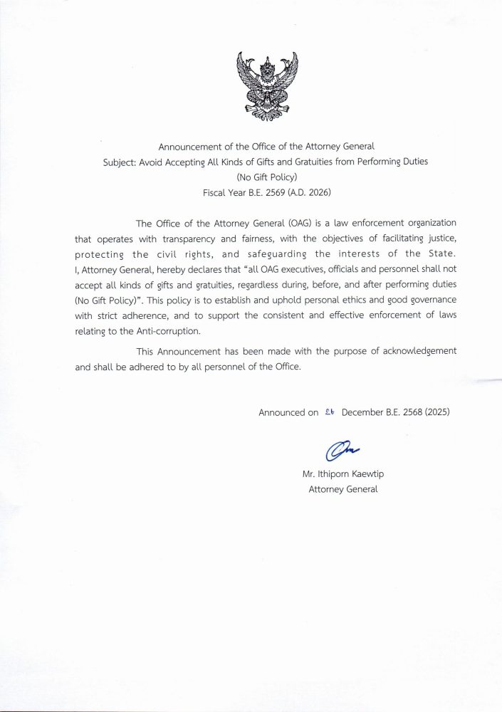 สำนักงานคดีล้มละลาย ขับเคลื่อนการดำเนินการนโยบาย “No Gift Policy” สำนักงานอัยการสูงสุด ประจำปี พ.ศ. 2569
