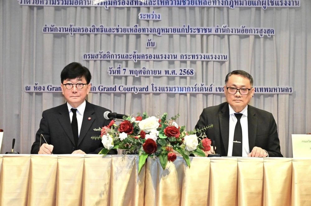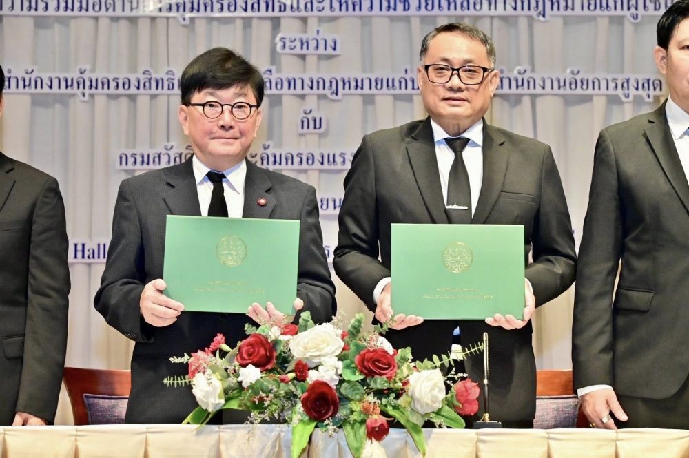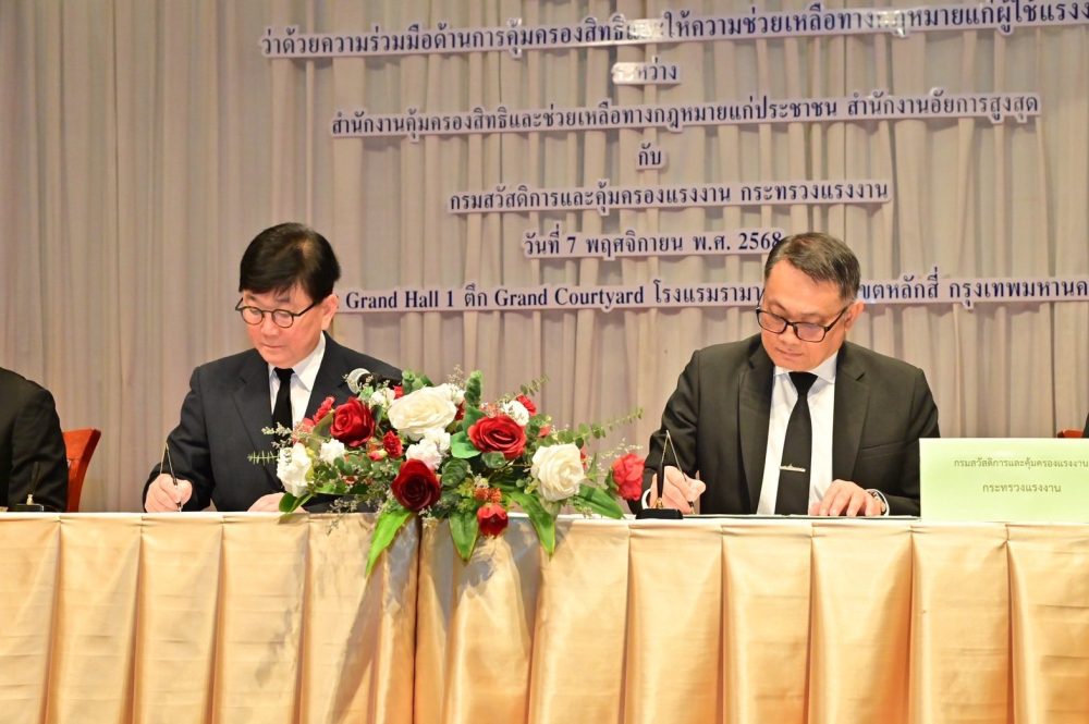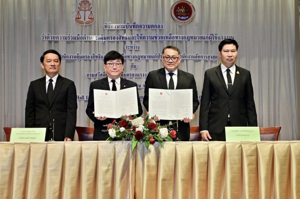 พิธีลงนามบันทึกความตกลงว่าด้วยความร่วมมือด้านการคุ้มครองสิทธิ์และให้ความช่วยเหลือทางกฎหมายแก่ผู้ใช้แรงงาน ระหว่าง สำนักงานอัยการสูงสุด และกรมสวัสดิการและคุ้มครองแรงงาน โดย อธิบดีอัยการ คุ้มครองสิทธิและช่วยเหลือทางกฎหมายแก่ประชาชน นาย โกศลวัฒน์ อินทุจันทร์ยง และอธิบดีกรมสวัสดิการและคุ้มครองแรงงาน รอ. สาโรจน์ คมคาย