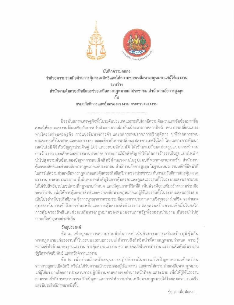 แม้ว่า ในการทำงาน ในความร่วมมือของภาคราชการ จะมีการประสานงานกันอยู่แล้ว โดยอัยการจังหวัดคุ้มครองสิทธิ และช่วยเหลือทางกฎหมาย 120 กว่าสาขา ของอัยการ ทั่วประเทศ ประสานงาน กับสวัสดิการและคุ้มครองแรงงานจังหวัดทำงานร่วมมือกันเป็นประจำ เพื่อให้ความช่วยเหลือผู้ใช้แรงงานเพื่อให้ชีวิตผ่านพ้นอุปสรรคทั้งทางกฎหมาย และวิกฤติจากสถานการณ์ ต่างๆ เช่นภัยสงครามจากอิสราเอล ภัยจากหนี้นอกระบบ ภัยจากความไม่รู้กฎหมาย เราประสานงานร่วมมือกันช่วยเหลือผู้ใช้แรงงานเป็นประจำอยู่แล้วเพื่อให้ผู้ใช้แรงงานที่ประสบปัญหาดำเนินชีวิตต่อไปได้และวันนี้เพื่อสร้างความตระหนักรู้ทั้งสองหน่วยงาน จึงได้จัดพิธีลงนามบันทึกความร่วมมือโดยมีผู้แทนฝ่ายอัยการผู้แทนฝ่ายกรมสวัสดิการและคุ้มครองแรงงาน จากทุกจังหวัด
