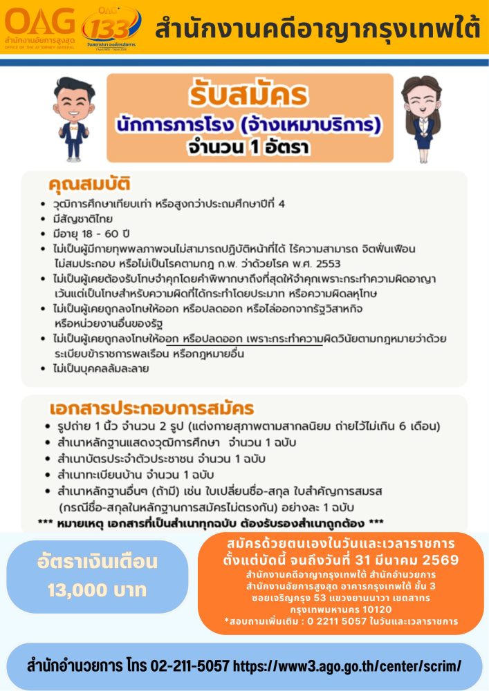 วันพฤหัสบดีที่ 12 มีนาคม 2569 เวลา 10.00 น. นายมงคล ไชยสิงห์ อธิบดีอัยการ สำนักงานคดีอาญากรุงเทพใต้