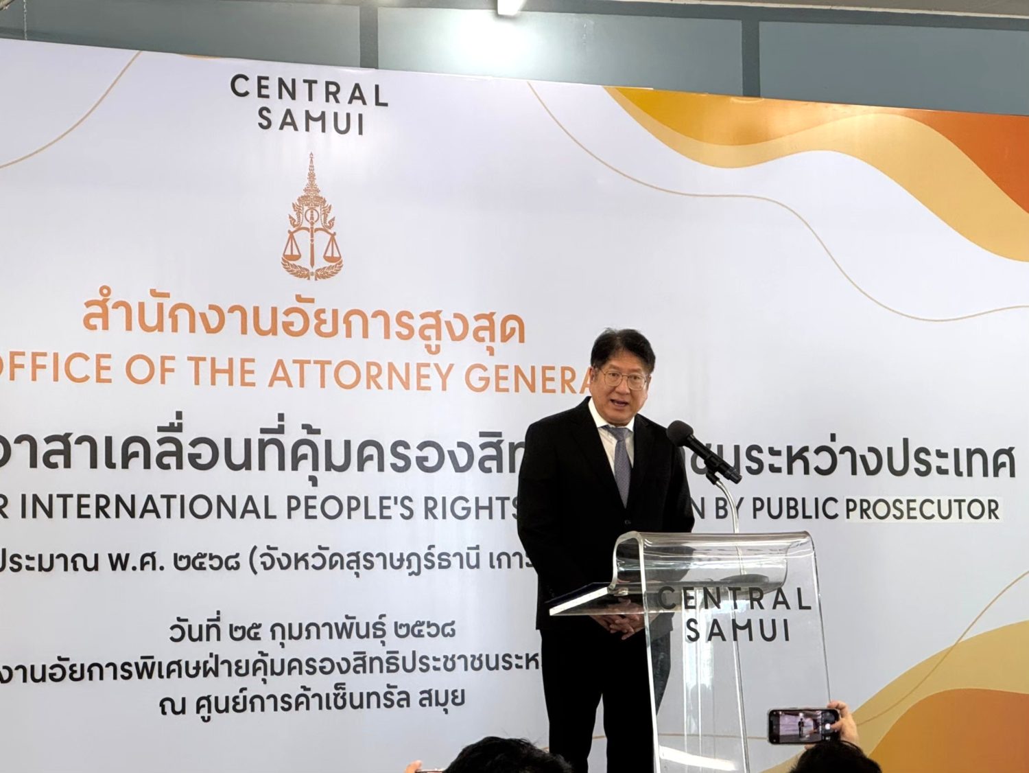 นายไพรัช พรสมบูรณ์ศิริ อัยการสูงสุด กล่าวว่า นอกจากการอำนวยความยุติธรรมทางอาญา และการรักษาผลประโยชน์ของรัฐแล้ว อีกภารกิจหนึ่งที่สำคัญของสำนักงานอัยการสูงสุด คือ การคุ้มครองสิทธิและช่วยเหลือทางกฎหมายแก่ประชาชน ไม่ว่าจะเป็นคนไทยทั้งที่อยู่ในประเทศและต่างประเทศ รวมถึงคนต่างชาติที่อยู่ในประเทศไทยหรือที่มีนิติสัมพันธ์ตามกฎหมายไทย และเล็งเห็นว่าอำเภอเกาะสมุย และอำเภอเกาะพะงัน จังหวัดสุราษฎร์ธานีเป็นพื้นที่เศรษฐกิจและเมืองท่องเที่ยวสำคัญที่มีคนต่างชาติเข้ามาเยี่ยมเยียนในฐานะนักท่องเที่ยว และอาศัยอยู่ทั้งแบบชั่วคราวและถาวรเป็นจำนวนไม่น้อย ประกอบกับความก้าวหน้าทางเทคโนโลยีในปัจจุบันทำให้ผู้คนจากทุกมุมโลก สามารถสร้างความสัมพันธ์ระหว่างกันได้อย่างไร้พรมแดน ส่งผลให้คนไทยและคนต่างชาติมีความเกี่ยวพันและมีนิติสัมพันธ์ระหว่างกันมากขึ้นตามไปด้วย ซึ่งข้อมูลจากการให้คำปรึกษาและช่วยเหลือทางกฎหมายที่ผ่านมาสะท้อนให้เห็นว่า มีประชาชนทั้งคนไทยและคนต่างชาติจำนวนไม่น้อยที่ยังประสบปัญหาด้านกฎหมายและการดำเนินการเพื่อให้ได้มาซึ่งสิทธิและหน้าที่โดยชอบตามกฎหมาย จึงได้มอบหมายให้สำนักงานอัยการพิเศษฝ่ายคุ้มครองสิทธิประชาชนระหว่างประเทศ สำนักงานคุ้มครองสิทธิและช่วยเหลือทางกฎหมายแก่ประชาชน จัดโครงการคลินิกอัยการอาสาเคลื่อนที่คุ้มครองสิทธิประชาชนระหว่างประเทศ ประจำปีงบประมาณ พ.ศ. 2568 ขึ้นในพื้นที่อำเภอเกาะสมุย และอำเภอเกาะพะงัน จังหวัดสุราษฎร์ธานี