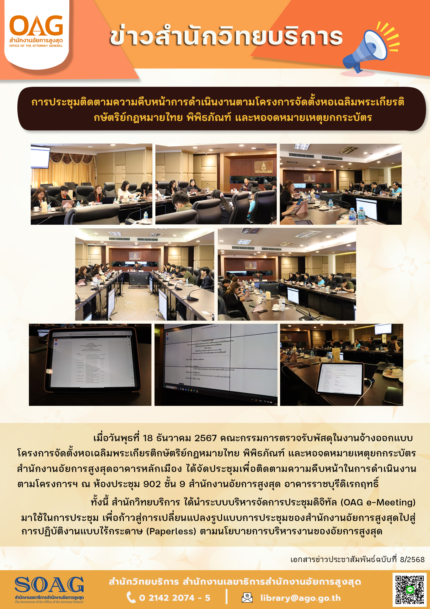 ทั้งนี้ สำนักวิทยบริการ ได้นำระบบบริหารจัดการประชุมดิจิทัล (OAG e-Meeting)