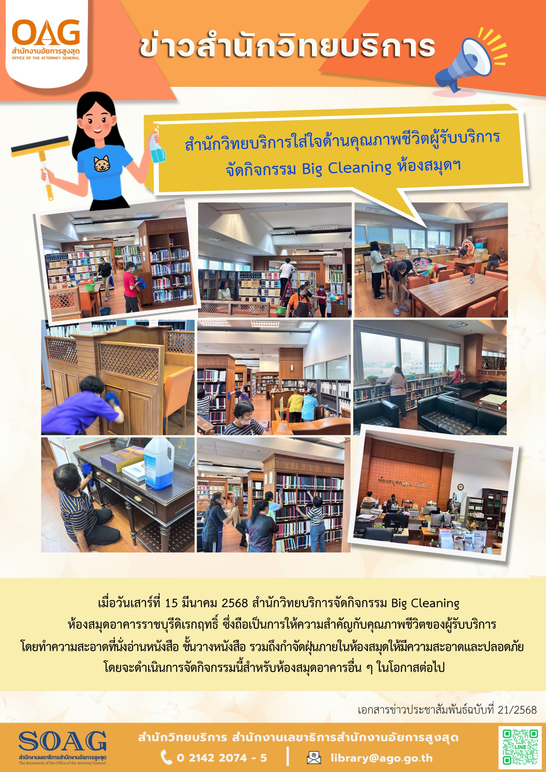 เมื่อวันเสาร์ที่ 15 มีนาคม 2568 สำนักวิทยบริการจัดกิจกรรม Big Cleaning ห้องสมุดอาคารราชบุรีดิเรกฤทธิ์ ซึ่งถือเป็นการให้ความสำคัญกับคุณภาพชีวิตของผู้รับบริการโดยทำความสะอาดที่นั่งอ่านหนังสือ ชั้นวางหนังสือ รวมถึงกำจัดฝุ่นภายในห้องสมุดให้มีความสะอาดและปลอดภัย โดยจะดำเนินการจัดกิจกรรมนี้สำหรับห้องสมุดอาคารอื่น ๆ ในโอกาสต่อไป