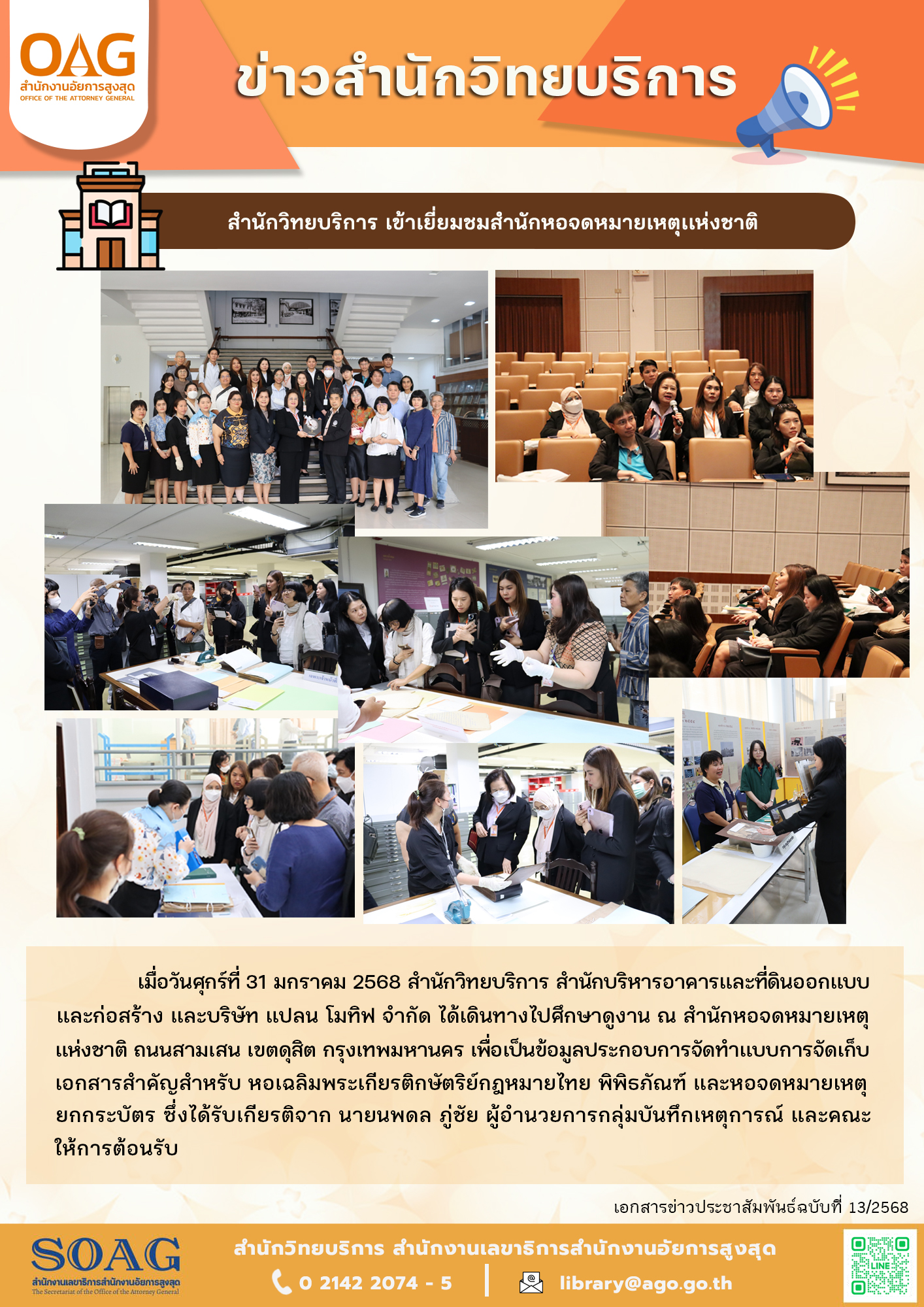 เมื่อวันศุกร์ที่ 31 มกราคม 2568 สำนักวิทยบริการ สำนักบริหารอาคารและที่ดินออกแบบและก่อสร้าง และบริษัท แปลน โมทิฟ จำกัด ได้เดินทางไปศึกษาดูงาน ณ สำนักหอจดหมายเหตุแห่งชาติ ถนนสามเสน เขตดุสิต กรุงเทพมหานคร เพื่อเป็นข้อมูลประกอบการจัดทำแบบการจัดเก็บเอกสารสำคัญสำหรับ หอเฉลิมพระเกียรติกษัตริย์กฎหมายไทย พิพิธภัณฑ์ และหออดหมายเหตุยกกระบัตร ซึ่งได้รับเกียรติจาก นายนพดล ภู่ชัย ผู้อำนวยการกลุ่มบันทึกเหตุการณ์ และคณะ ให้การต้อนรับ