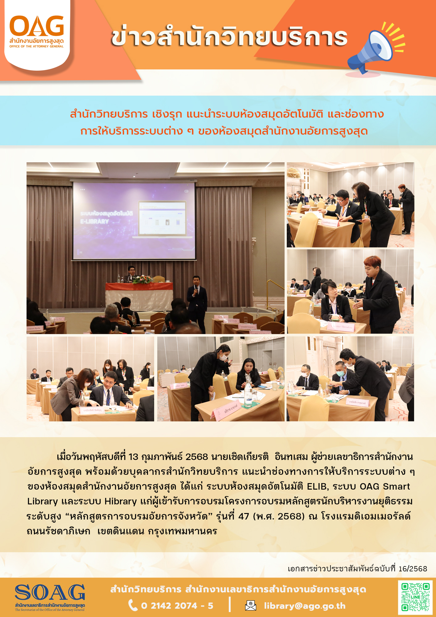 เมื่อวันพฤหัสบดีที่ 13 กุมภาพันธ์ 2568 นายเชิดเกียรติ อินทเสม ผู้ช่วยเลขาธิการสำนักงานอัยการสูงสุด พร้อมด้วยบุคลากรสำนักวิทยบริการ แนะนำช่องทางการให้บริการระบบต่าง ๆ ของห้องสมุดสำนักงาน อัยการสูงสุด ได้แก่ ระบบห้องสมุดอัตโนมัติ ELIB, ระบบ OAG Smart Library และระบบ Hibrary แก่ผู้เข้ารับการอบรมโครงการอบรมหลักสูตรนักบริหารงานยุติธรรมระดับสูง “หลักสูตรการอบรมอัยการจังหวัด” รุ่นที่ 47 (พ.ศ. 2568) ณ โรงแรมดิเอมเมอรัลด์ ถนนรัชดาภิเษก เขตดินแดน กรุงเทพมหานคร