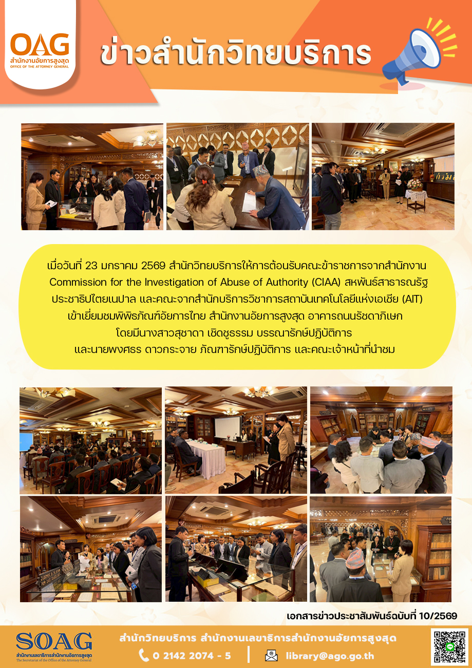 ข้าราชการจากสำนักงาน Commission for the Investigation of Abuse of Authority (CIAA) สหพันธ์สาธารณรัฐประชาธิปไตยเนปาลและคณะจากสำนักบริการวิชาการ สถาบันเทคโนโลยีแห่งเอเชีย (AIT) เข้าเยี่ยมชมพิพิธภัณฑ์อัยการไทย สำนักงานอัยการสูงสุด อาคารถนนรัชดาภิเษก โดยมีนางสาวสุชาดา เชิดชูธรรม บรรณารักษ์ปฏิบัติการ นายพงศธร ดาวกระจาย ภัณฑารักษ์ปฏิบัติการ และคณะเจ้าหน้าที่ นำชมพิพิธภัณฑ์อัยการไทย