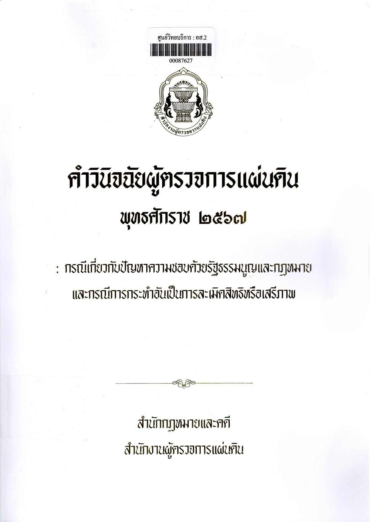 คำวินิจฉัยผู้ตรวจการแผ่นดิน พุทธศักราช 2567 : กรณีเกี่ยวกับปัญหาความชอบด้วยรัฐธรรมนูญและกฎหมายและกรณีการกระทำอันเป็นการละเมิดสิทธิหรือเสรีภาพ