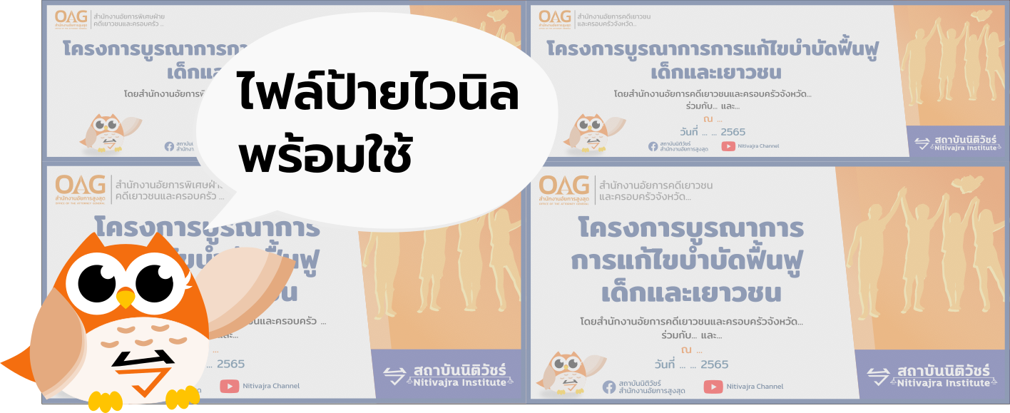 โครงการบูรณาการการแก้ไขบำบัดฟื้นฟูเด็กและเยาวชน โครงการบูรณาการการแก้ไขบำบัดฟื้นฟูเด็กและเยาวชนกิจกรรม : การอบรมให้ความรู้แก่เด็กและเยาวชน เอกสารที่ใช้ในการทำกิจกรรม โครงการ (docx) (pdf)กำหนดการ (docx) (pdf)ประมาณการค่าใช้จ่าย (docx) (pdf)คำสั่งแต่งตั้งวิทยากร (docx) (pdf)หนังสือเชิญวิทยากร (docx) (pdf)หนังสือเชิญบุคคลภายนอก (docx) (pdf)แบบตอบรับ (docx) (pdf)ใบลงทะเบียน (docx) (pdf)แบบประเมินการทำกิจกรรม (docx) (pdf)ใบสำคัญรับเงิน (docx) (pdf)สรุปผลการดำเนินกิจกรรม (docx) (pdf) สำหรับสำนักงานอัยการที่ต้องการจัดทำป้ายไวนิล *ฟอนต์ที่ใช้ Kanit และ Mitr ขนาด 3*1 เมตร สำหรับกรุงเทพมหานคร (svg)ขนาด 3*1.5 เมตร สำหรับกรุงเทพมหานคร (svg)ขนาด 3*1 เมตร สำหรับต่างจังหวัด (svg)ขนาด 3*1.5 เมตร สำหรับต่างจังหวัด (svg)
