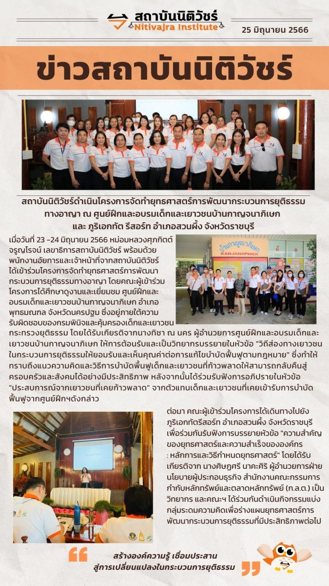 สถาบันนิติวัชร์ดำเนินโครงการจัดทำยุทธศาสตร์การพัฒนากระบวนการยุติธรรม ทางอาญา ณ ศูนย์ฝึกและอบรมเด็กและเยาวชนบ้านกาญจนาภิเษก และ ภูริเอกทัต รีสอร์ท อำเภอสวนผึ้ง จังหวัดราชบุรี
