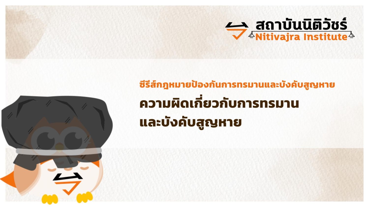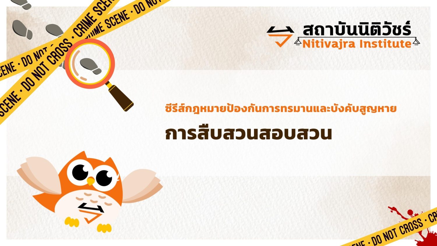 กระบวนการยุติธรรมทางอาญา ซีรีส์กฎหมายป้องกันการทรมานและบังคับสูญหาย 1. ความผิดเกี่ยวกับการทรมาณและบังคับสูญหาย 2. การควบคุมตัว 3. การสืบสวนสอบสวน 4. สิทธิของผู้เสียหาย 5. เขตอำนาจศาล 6. คณะกรรมการป้องกันและปราบปราม การทรมานและการกระทำให้บุคคลสูญหาย