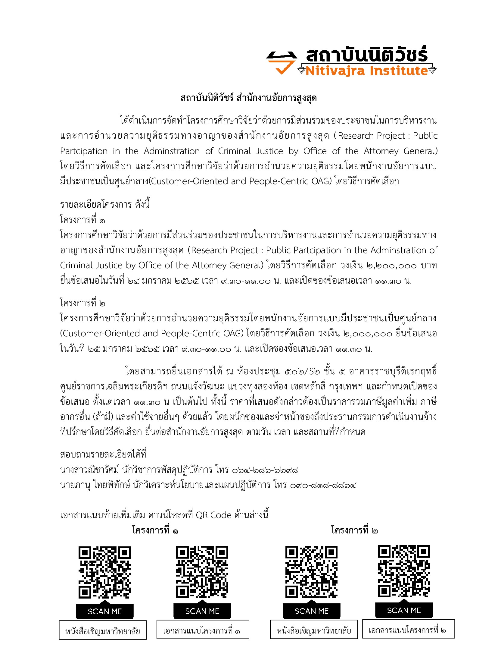 ข่าวประชาสัมพันธ์ สถาบันนิติวัชร์ ขอเชิญสถาบันการศึกษา 16 แห่ง ยื่นข้อเสนอโครงการศึกษาวิจัย 2 โครงการ ด้วยวิธีการคัดเลือก