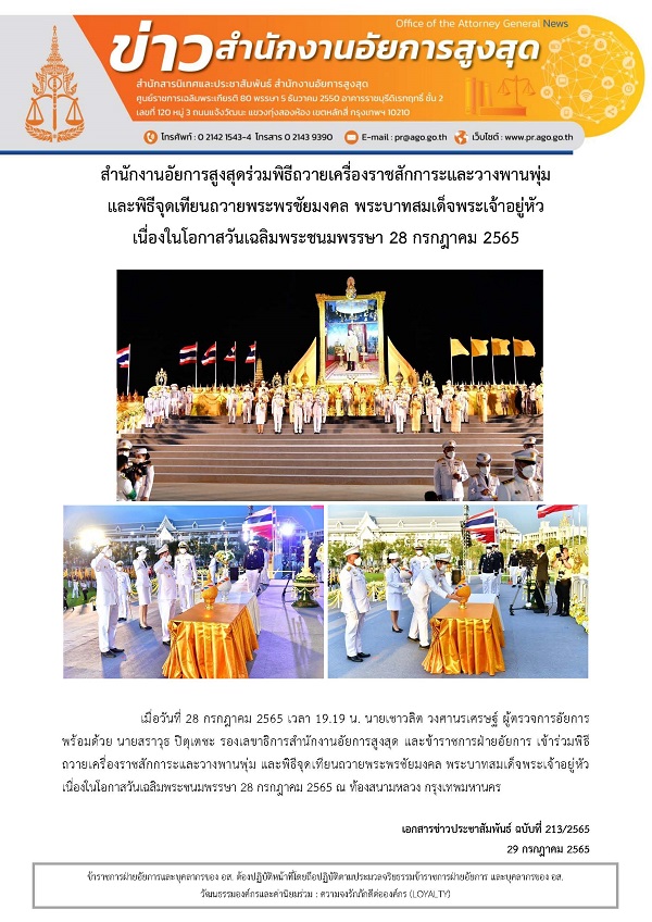 เลขาธิการสำนักงานอัยการสูงสุด ร่วมพิธีถวายเครื่องราชสักการะและวางพานพุ่ม และพิธีจุดเทียนถวายพระพรชัยมงคล พระบาทสมเด็จพระเจ้าอยู่หัว เนื่องในโอกาสวันเฉลิมพระชนมพรรษา 28 กรกฎาคม 2565