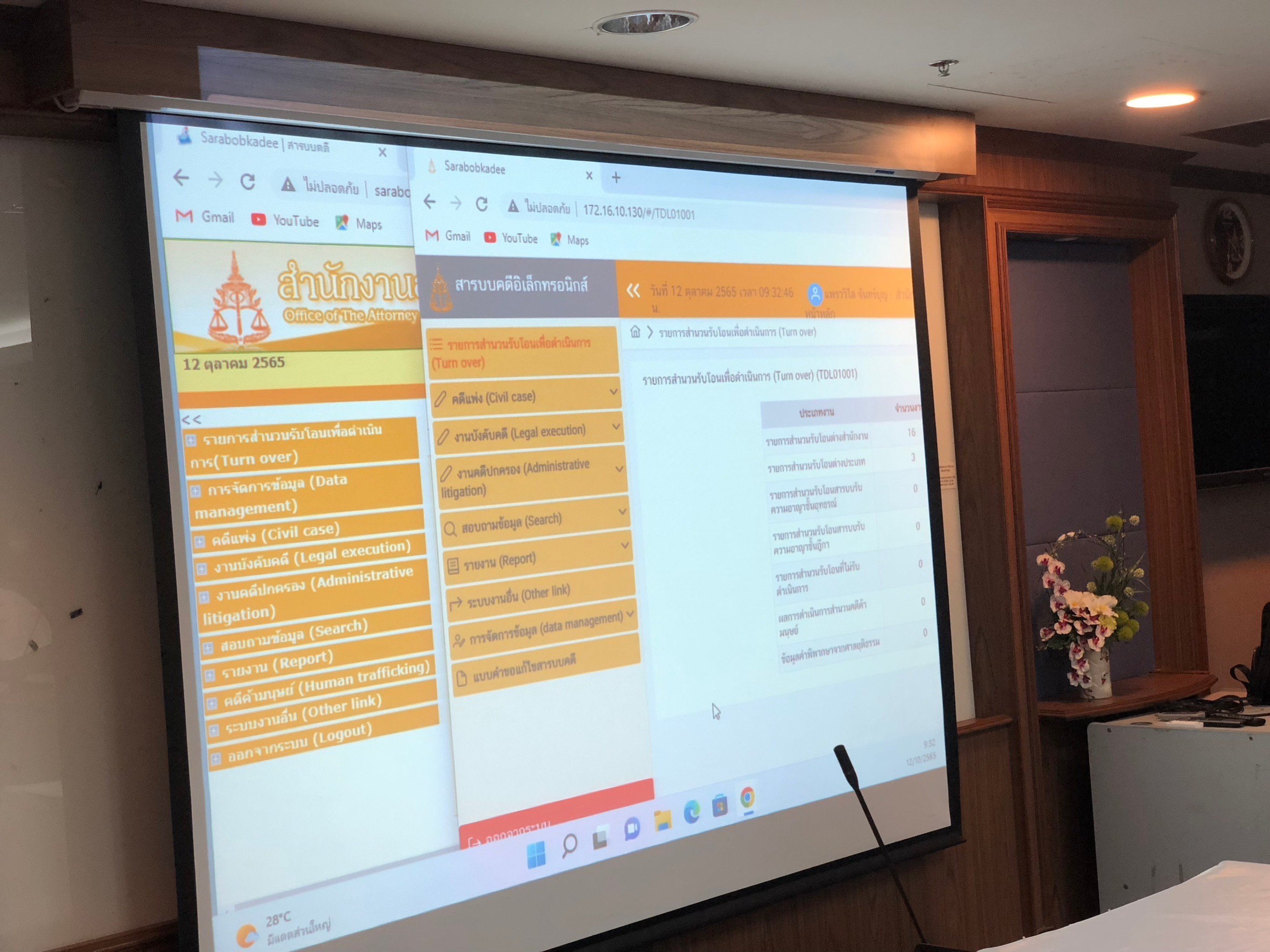 สำนักเทคโนโลยีสารสนเทศและการสื่อสารดำเนินการทดสอบการใช้งานระบบสารบบคดีอิเล็กทรอนิกส์ ภายหลังการโอนย้ายระบบและฐานข้อมูลสารบบคดีอิเล็กทรอนิกส์ ตามโครงการจัดหาเครื่องคอมพิวเตอร์แม่ข่ายขนาดใหญ่เพื่อทดแทนเครื่องเดิมของสำนักงานอัยการสูงสุด เพื่อเป็นการยืนยันว่าระบบและฐานข้อมูลสารบบคดีอิเล็กทรอนิกส์สามารถทำงานได้อย่างถูกต้อง สมบูรณ์ โดยร่วมกับบุคลากรสำนักงานคดีแพ่ง จำนวน 5 คน เมื่อวันพุธที่ 12 ตุลาคม 2565 เวลา 09.00 – 16.00 น. ณ ห้องประชุม 701/S3 สำนักงานอัยการสูงสุด อาคารราชบุรีดิเรกฤทธิ์