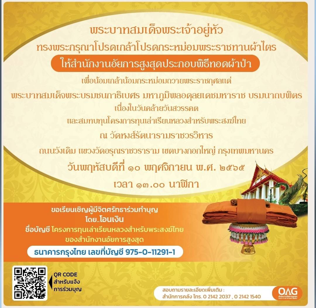 ขอเชิญร่วมทําบุญและร่วมพิธีทอดผ้าป่าสมทบทุนโครงการทุนเล่าเรียนหลวงสําหรับพระสงฆ์ไทยของสํานักงานอัยการสูงสุด ข่าวประชาสัมพันธ์ ว 9 เรื่อง ขอเชิญร่วมทําบุญและร่วมพิธีทอดผ้าป่าสมทบทุนโครงการทุนเล่าเรียนหลวงสําหรับพระสงฆ์ไทยของสํานักงานอัยการสูงสุดแบบฟอร์มแจ้งการร่วมทำบุญพิธีทอดผ้าป่าสมทบทุนโครงการทุนเล่าเรียนหลวงสำหรับพระสงฆ์ไทยของสำนักงานอัยการสูงสุด ณ วัดหงส์รัตนารามราชวรวิหาร กรุงเทพฯ Related